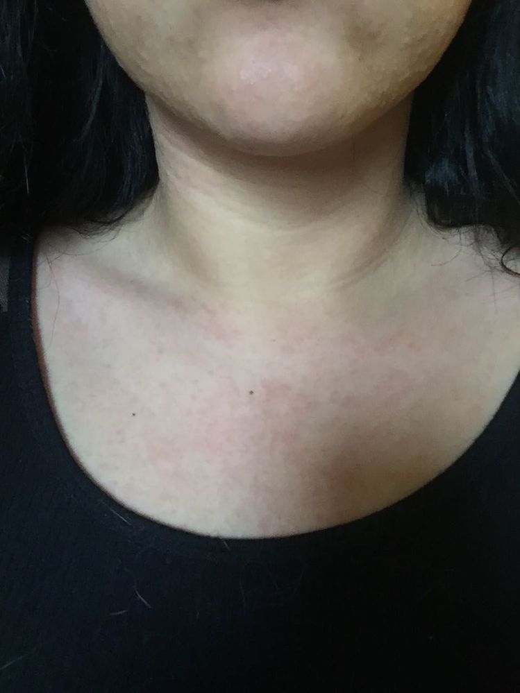 I can’t say for sure but the redness and Blotchiness on your chest could be an indication of allergy. If they are hives they could also be stress induced, although more likely it is an allergy. I would be sure to cleanse with a very sensitive cleanser you know works with your skin, take Benadryl. Also apply a very gentle, cream, i would suggest “Kate Somerville dleicate recovery cream” super Gentile healing That cream has saved my skin in a time of crisis! Kate is my super hero when it comes to all things skin!Good luck!